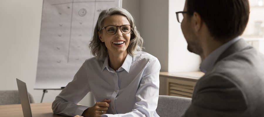 Happy mature woman negotiates with partner at conference table, lead pleasant business conversation, planning cooperation, working on task, selling company services to client during meeting in office