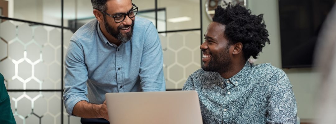 Portrait of two casual business partners sitting at table together and working. Group of creative businesspeople working together at modern office. Handsome mature businessman discussing affairs with african man and smiling together in a meetig room.